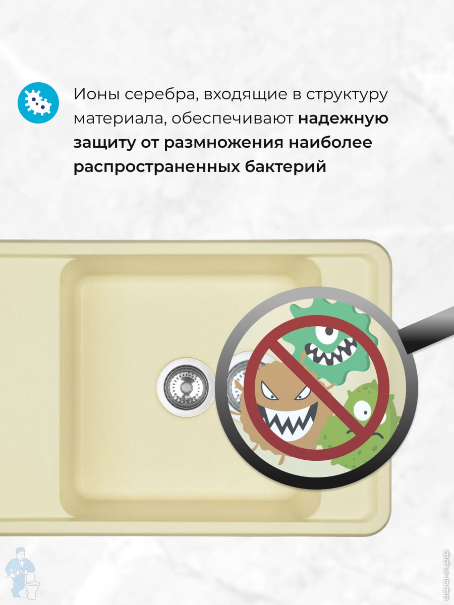 Покрытие Gelcoat обеспечивает высокую устойчивость к механическим воздействиям, которым подвергается поверхность мойки в процессе эксплуатации. Является стойким к большинству агрессивных и красящих веществ. Мойка обладает высокими бактерицидными свойствами и является экологически чистым изделием. Устойчива к резким перепадам температур.