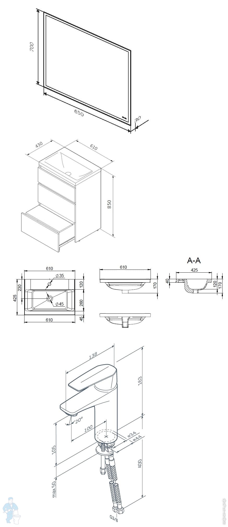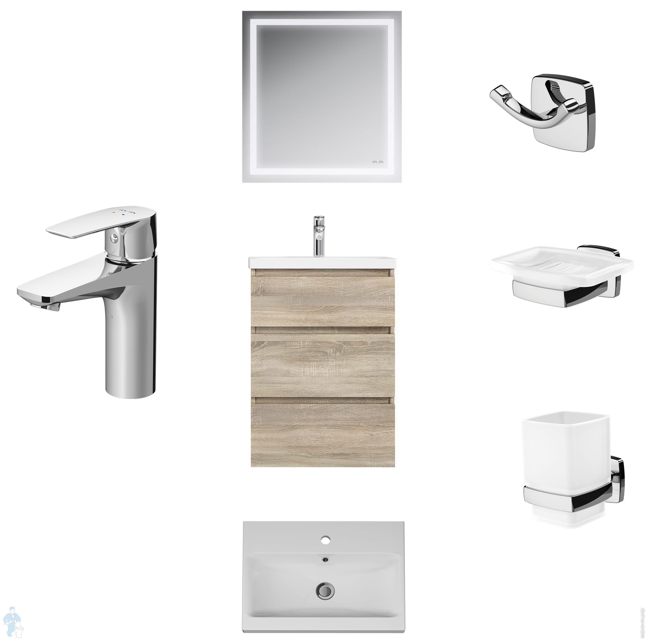 Напольный комплект AM.PM Gem S 60см BK91GC Тумба с раковиной, зеркало, смеситель и аксессуары