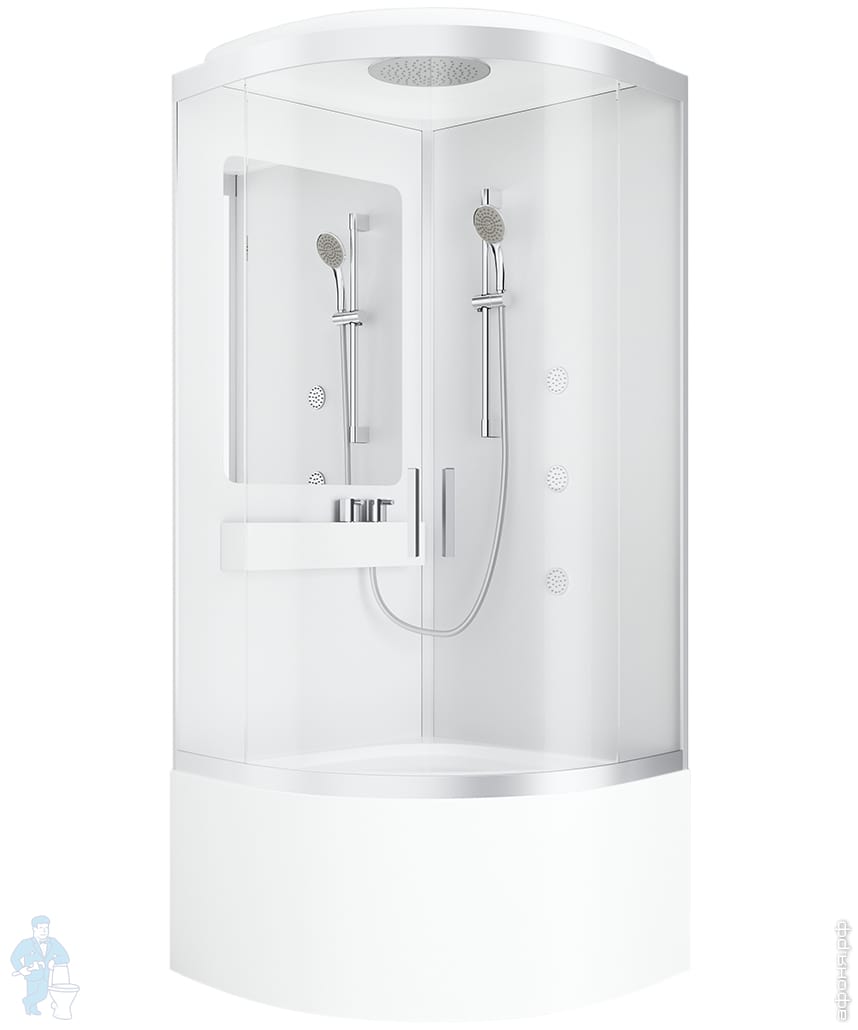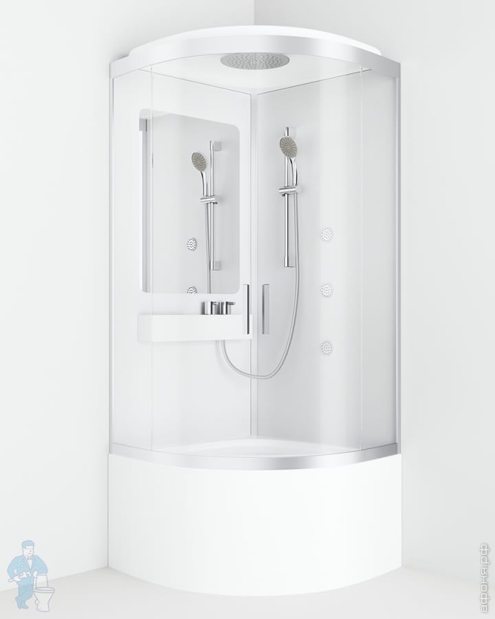 Премиальные решения в каждой детали: компактная вместительная полочка с интегрированным смесителем и переключателем, полноразмерное зеркало, встроенное в заднюю стенку – необходимое удобство и визуальное расширение пространства внутри кабины.