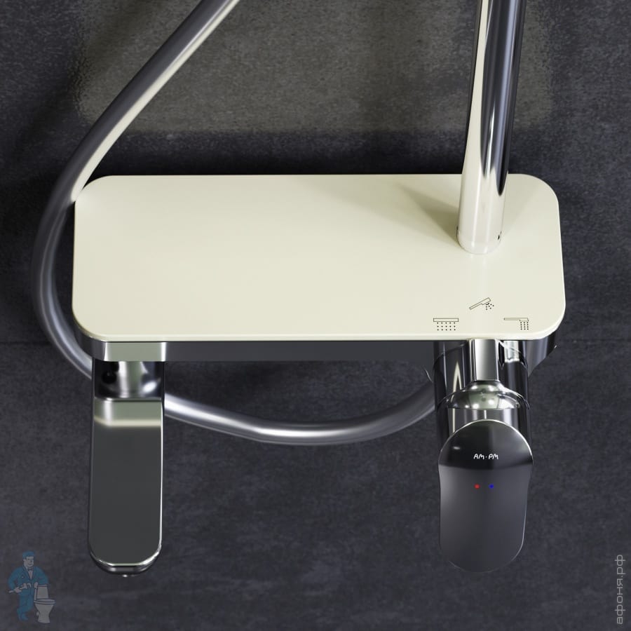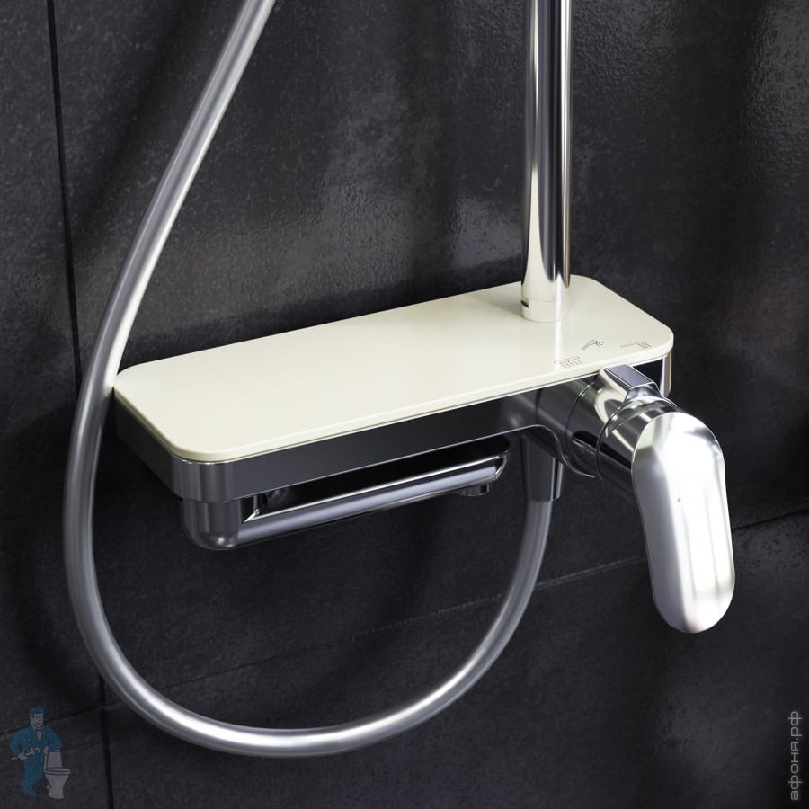 Смеситель выполнен в виде полочки. Чистый дизайн без лишних деталей: переключатель расположен за ручкой настройки температуры и позволяет менять источник потока воды от ручной лейки и излива до верхнего душа.