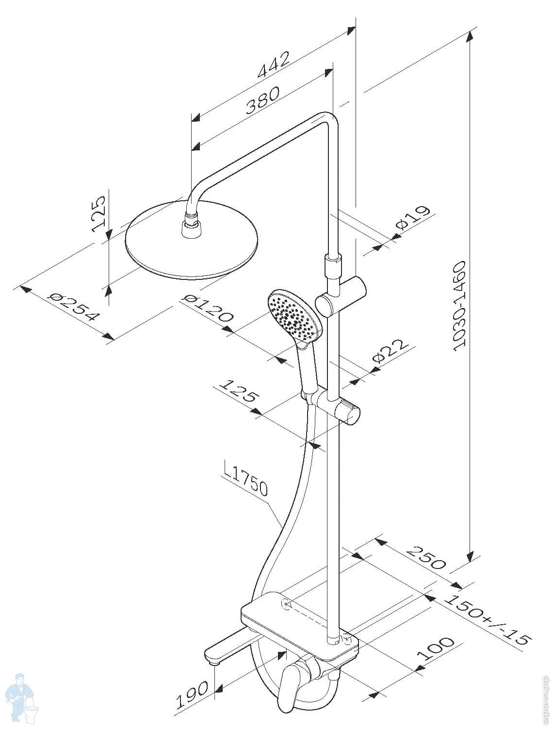 Телескопическая поворотная штанга регулируется по высоте в диапазоне от 1030 до 1460 мм, обеспечивая комфорт для людей любого роста, а шаровой шарнир в держателе верхнего душа позволяет регулировать угол его наклона.