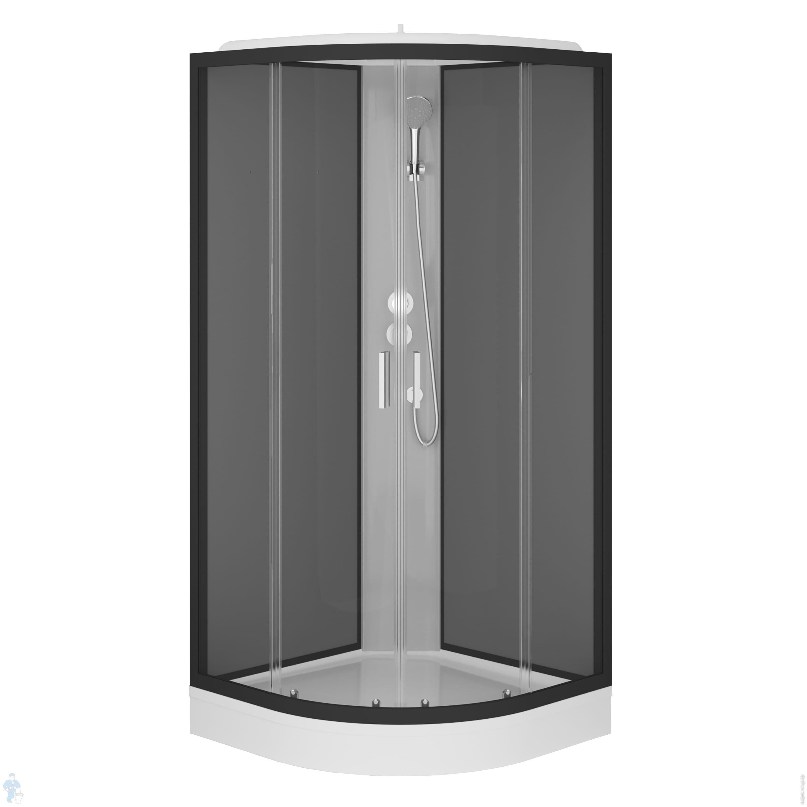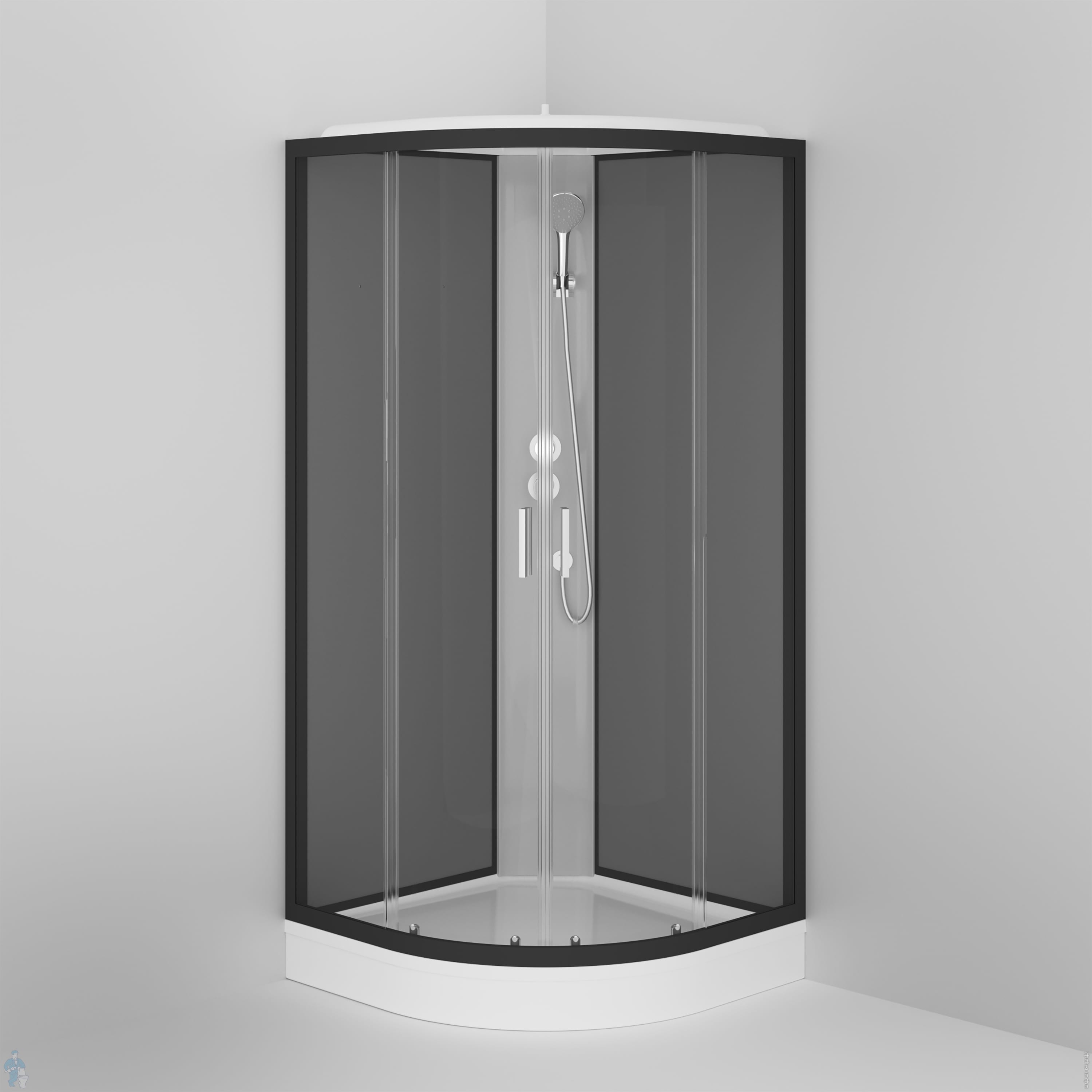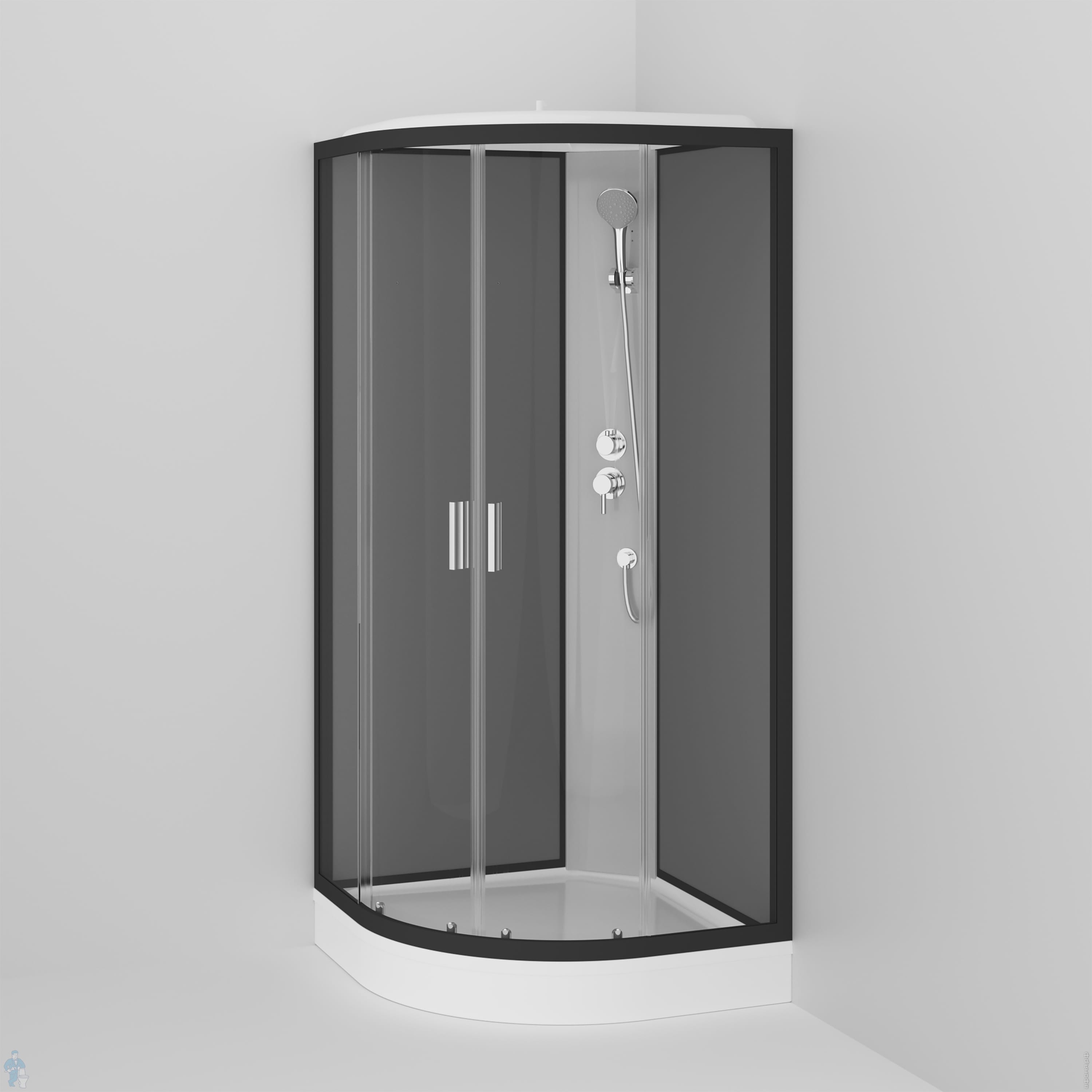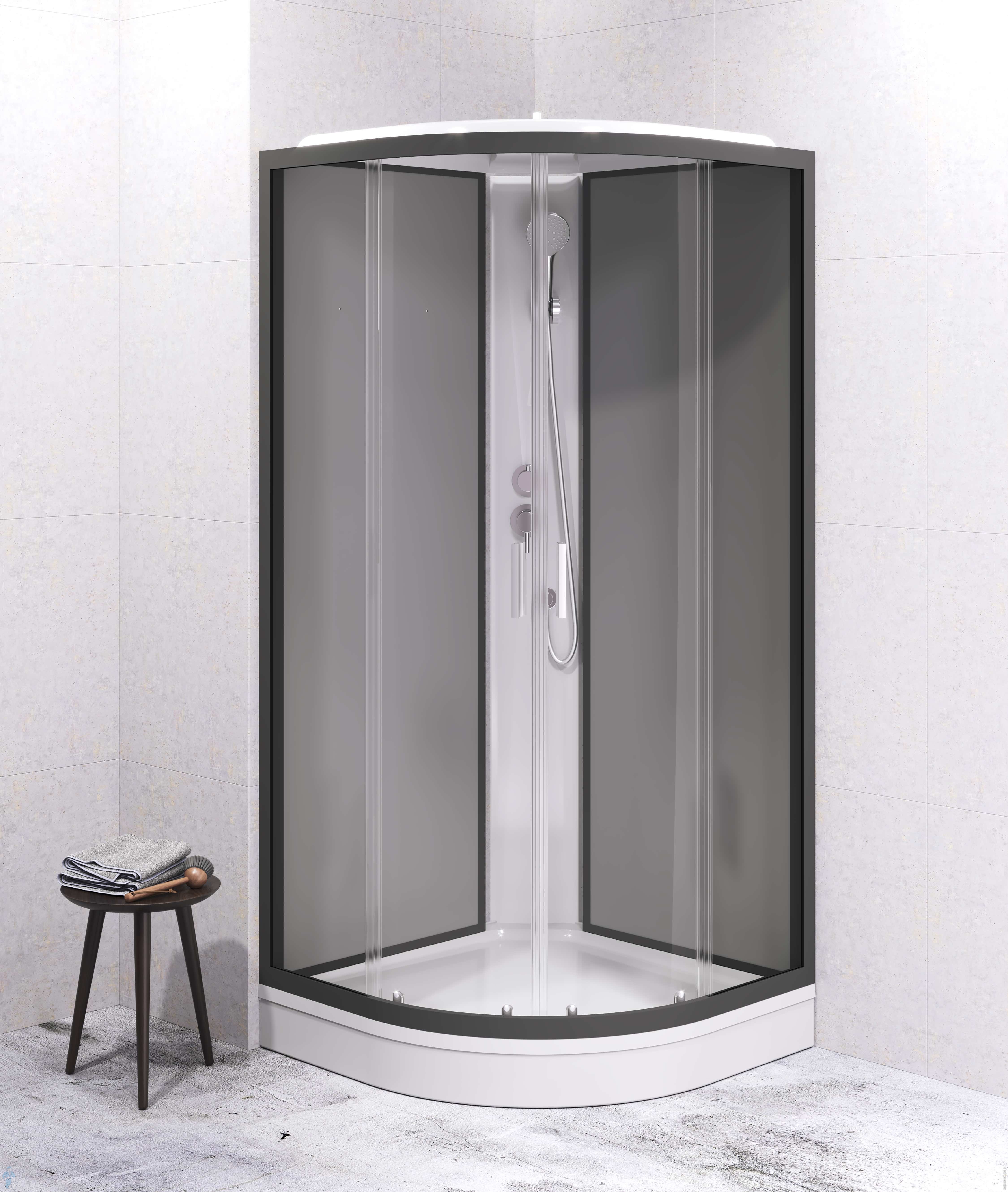 Комплектация: верхний душ, ручной душ, шланг, полочка, смеситель с переключателем, двойные металлические ролики, алюминиевые ручки дверей, сифон 90 мм
