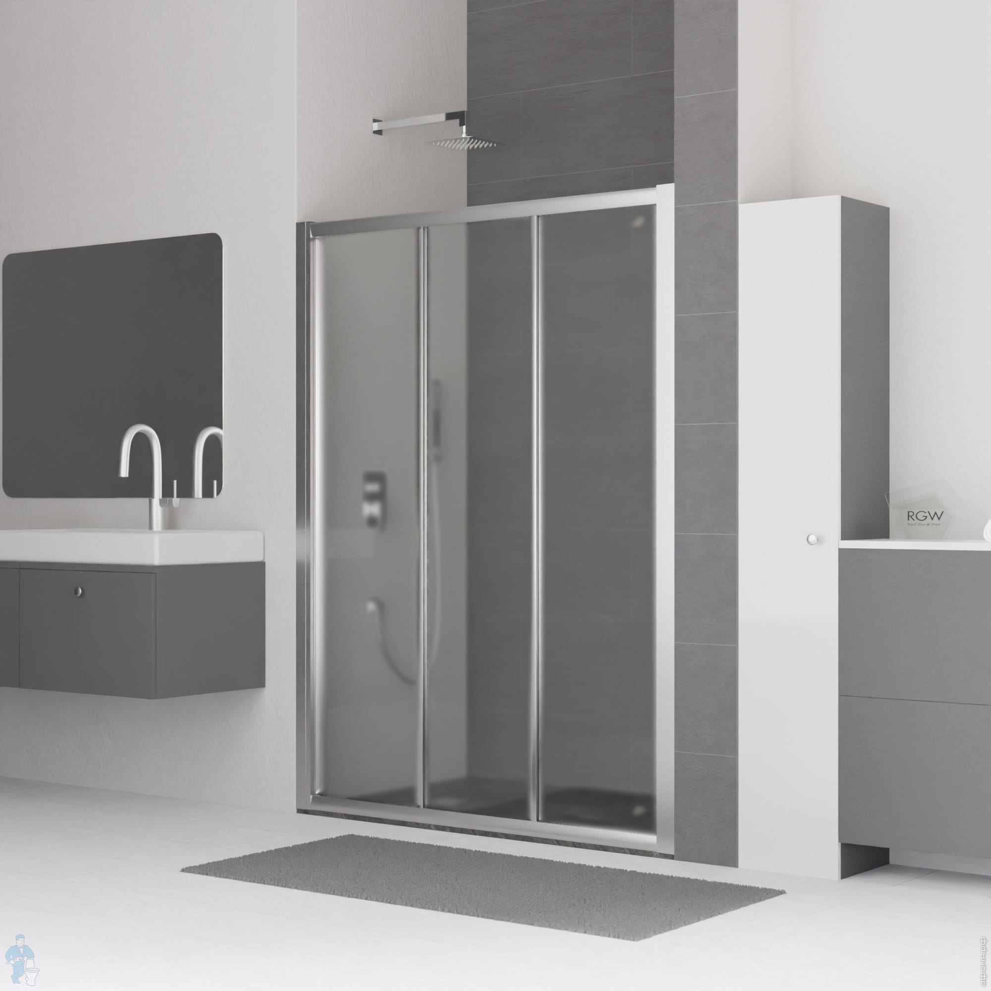 Душевое ограждение состоит из двух раздвижных дверей и одной фиксированной панели. Стекла каждой секции обрамлены по контуру алюминиевым профилем. Двери сдвигаются вдоль внутренней стороны неподвижной части, что позволяет разместить рядом с ограждением полотенцесушитель, тумбу, вешалку или иной элемент интерьера ванной комнаты.