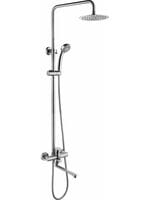 Комплектация состоит из: смесителя, душевой стойки, верхнего душа, душевой лейки, душевогошланга, держателя для душевой лейки, настенный держатель, отражателей и эксцентриков.