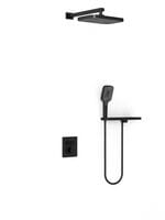 Идет в комплекте с: прямоугольным верхним душем, прямоугольным ручным душем, полкой с держателем для ручного душа и встраиваемым смесителем