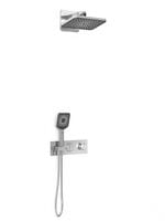 Идет в комплекте с: прямоугольным верхним душем, прямоугольным ручным душем, с держателем для ручного душа и встраиваемым смесителем