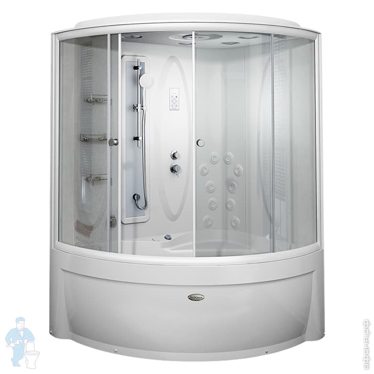 Душевой бокс ВИРСАВИЯ компл. 1 , правое исполнение, в комплекте: чаша ванны, рама-подставка, слив-перелив полуавтоматический, фронтальная панель, боковые стенки, центральная стойка, крыша, стеклянные шторки (прозрачные), контроллер 300, функция Пар , FM-приемник, освещение, динамик - 2 шт., вентилятор вытяжки, озоновая дезинфекция, 10 форсунок горизонтального душа, вертикальный душ Тропический дождь , 4-х позиционный смеситель, излив Лев 1 шт., 3 стеклянные полочки, ручной душ, молдинг.