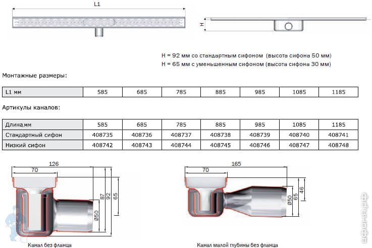 Душевой канал АСO Showerdrain C из нержавеющей стали - горизонтальный выпуск DN50, встроенный сифон из пластика, без фланца (ДхШхВ) 1185х70х92 мм \ 1185х70х65 мм