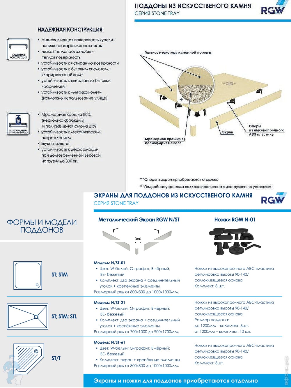 - Комплект ножек RGW N-01 (для поддонов длиной до 1100 мм включительно - 8 шт., от 1200 - 10 шт.)