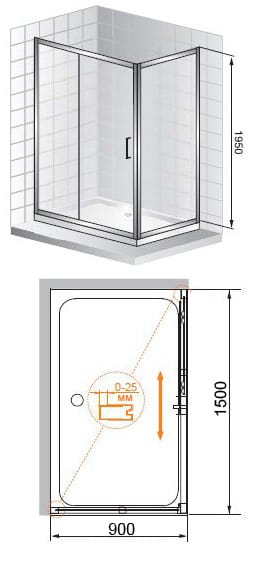 Регулировка ширины: предусмотрена за счет боковых профилей, диапазон регулировки указан на чертежеХарактеристики Душевой уголок CEZARES PORTA (1500х900х1950) AH-11-150/90-C-Cr стекло прозрачное, профиль хром