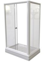 Комплектация: стеклянные шторки (матовые, 1 дверца), поддон на раме-подставке с устройством слива, профиль белый.