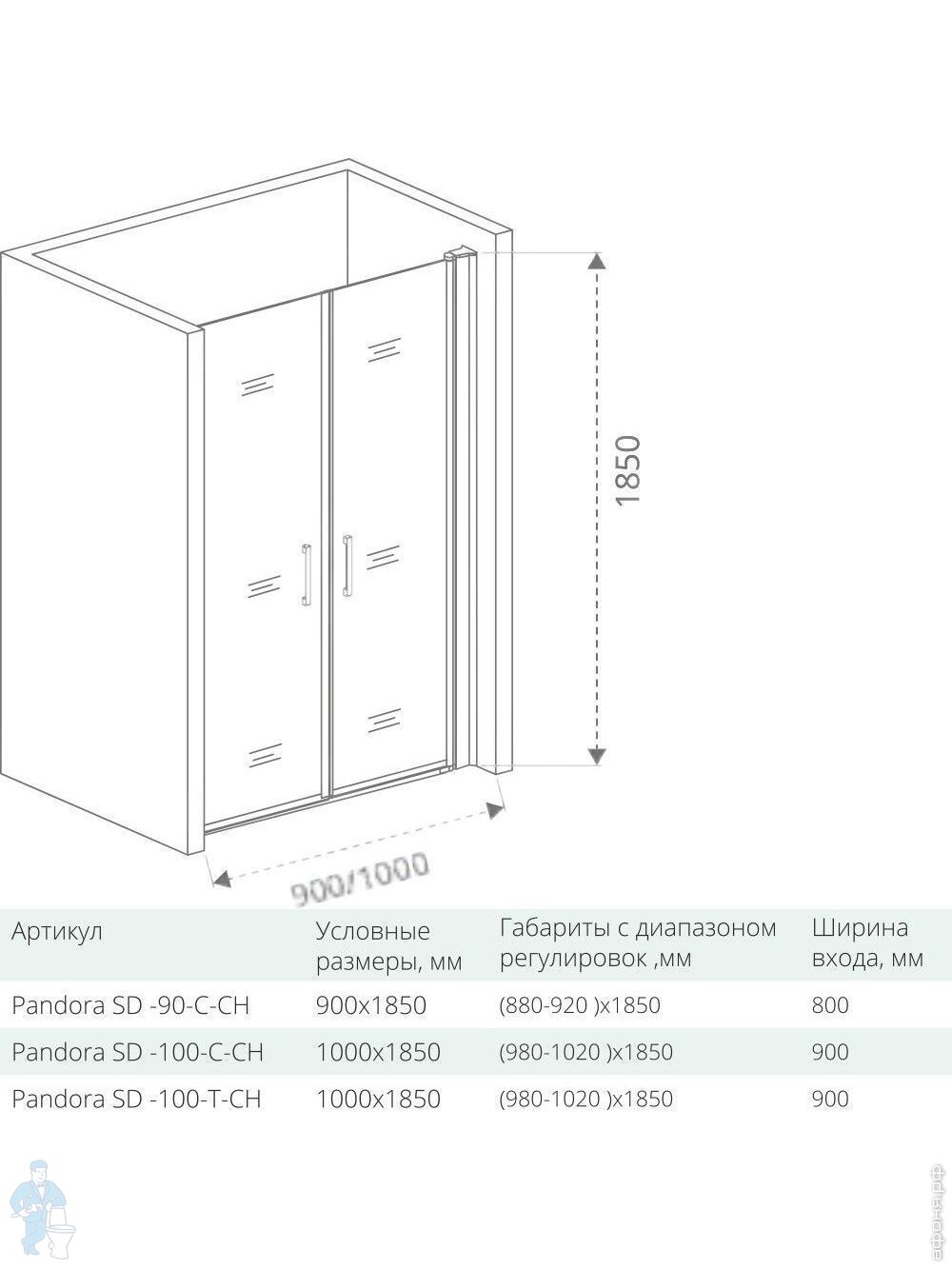 Дверь душевая GOOD DOOR BAS PANDORA SD-100-C-CH (100х185) 2 распашных двери, профиль хром/стекло прозрачное
