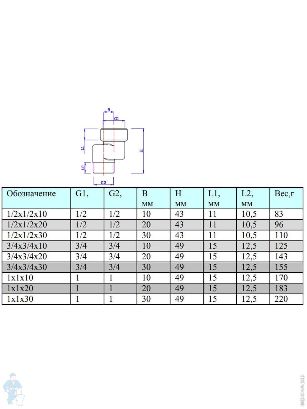 Резьба фитинга - внутренняя/наружная. Предлагаемые модели обеспечивают смещение оси трубопровода на 10, 20 или 30 мм.