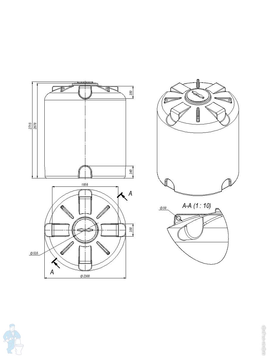 Имеет специальную форму для надежного подключения дополнительного оборудования и увеличенный диаметр заливной горловины, что обеспечивает удобство в эксплуатации. Диаметр горловины емкости составляет 535 мм, диаметр крышки 620мм.
