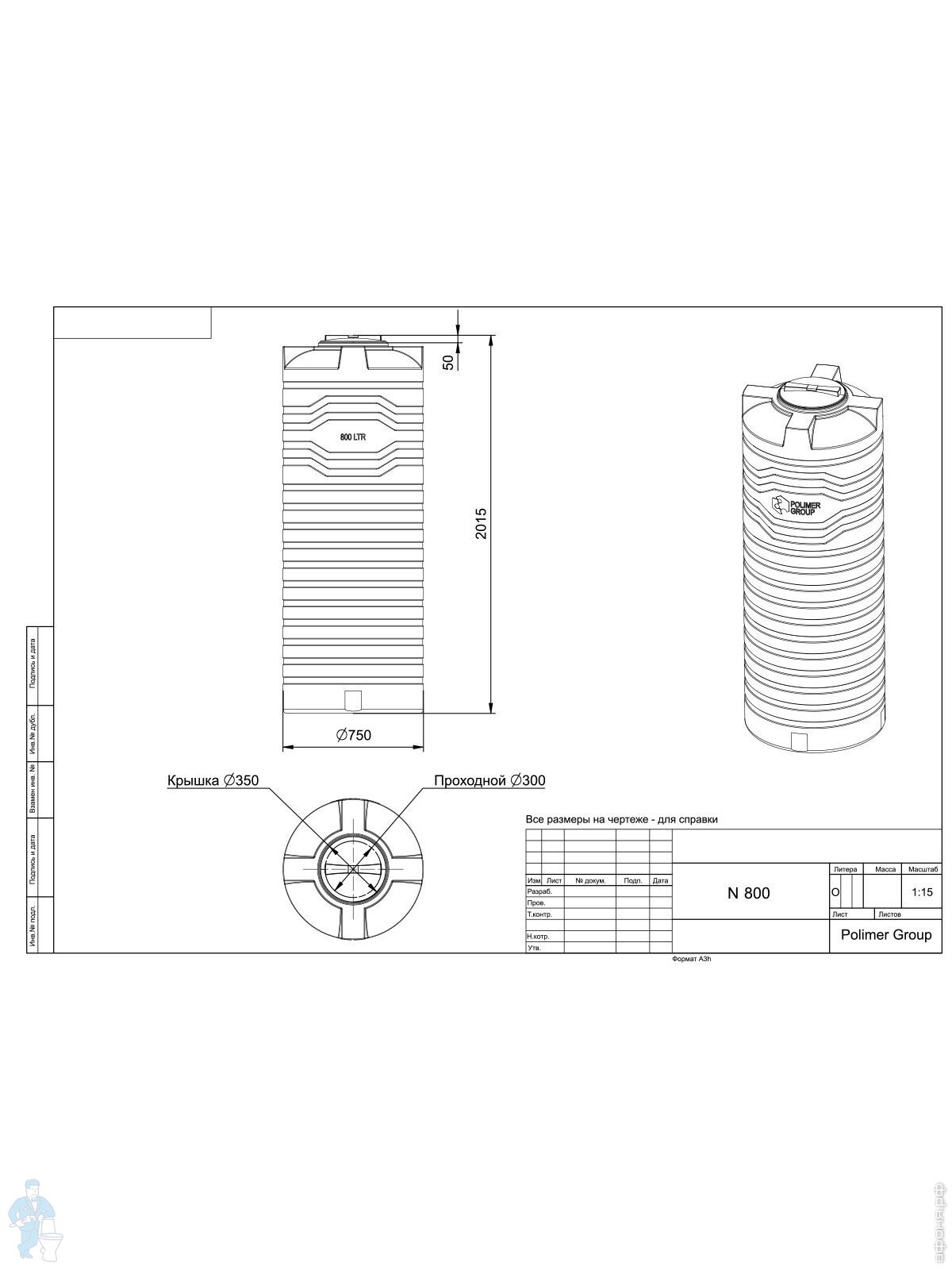 Емкость Polimer Group N-800 (2015х750) 800л, цилиндрическая, вертикальная, узкая, зеленый, TN800S2