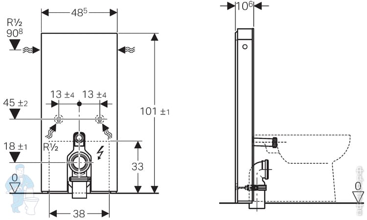 Для напольных унитазов с высотой подвода воды для смыва 32-36 см от пола согласно DIN EN 33