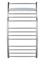 Здесь и форма "лесенка" для удобства сушки, и оригинальный изгиб вертикалей, и небольная стеклянная полка для хранения банных принадлежностей. И при всем этом разнообразии стилистических решений, модель не смотриться вычурно, скорее наоборот- легко и аккуратно.