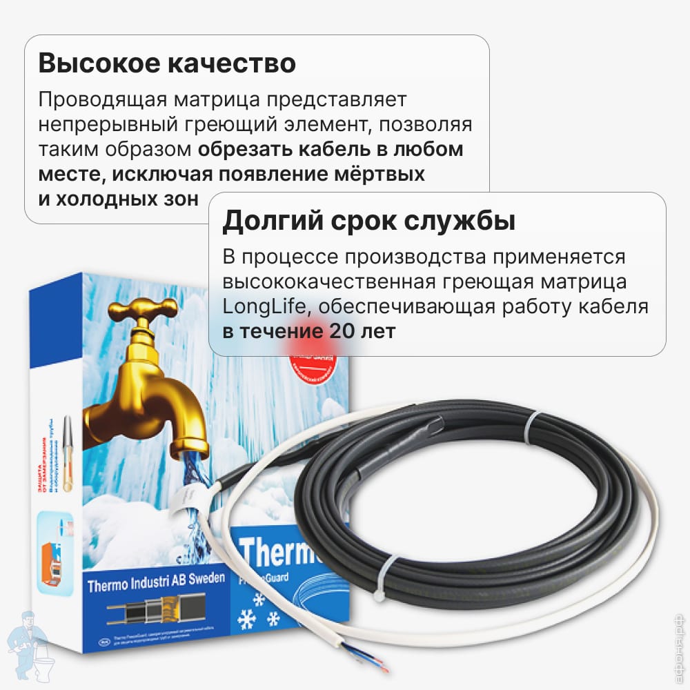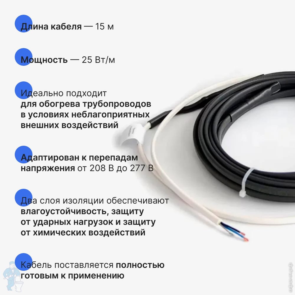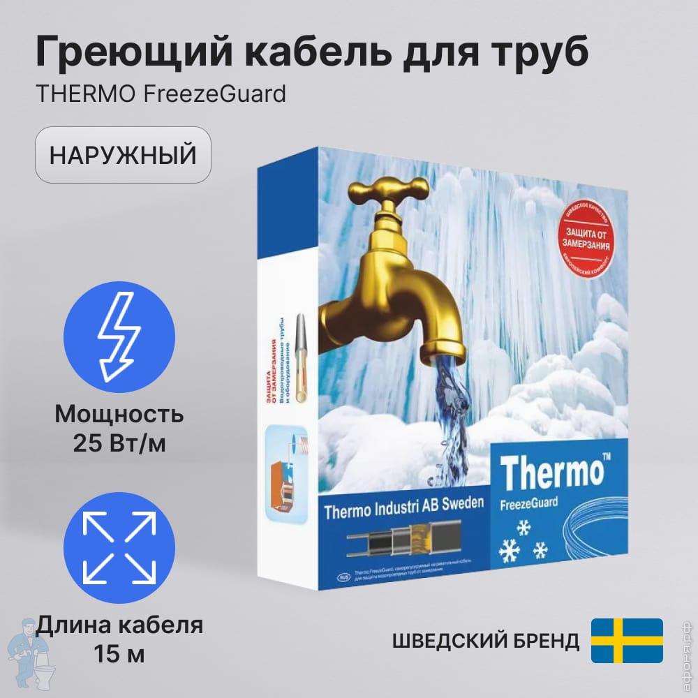 Греющий кабель для труб THERMO FreezeGuard 15м, 25Вт/пог.м, 375Вт, наружный