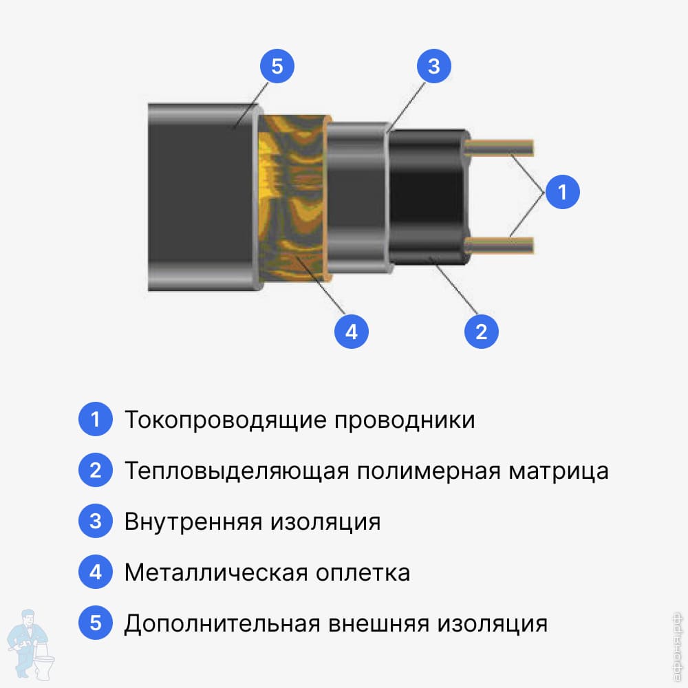 Параллельные шины обеспечивают напряжение по всей длине греющего кабеля. Проводящая матрица представляет непрерывный греющий элемент, позволяя таким образом обрезать кабель в любом месте, исключая появление мертвых и холодных зон. Греющий кабель приобретает свои свойства саморегуляции благодаря свойствам проводящей матрицы. По мере возрастания температуры материала матрицы, количество локальных проводящих связей в матрице уменьшается, автоматически уменьшая тепловыделение. При понижении температуры, количество локальных проводящих связей увеличивается, приводя к увеличению тепловыделения. Это происходит в каждой точке по длине саморегулирующегося кабеля, таким образом, выходная мощность зависит от условий окружающей среды по длине трубопровода. Способность саморегулирования дает возможность перехлестывать кабель, при этом не образуется горячих точек и зон локального перегрева.