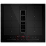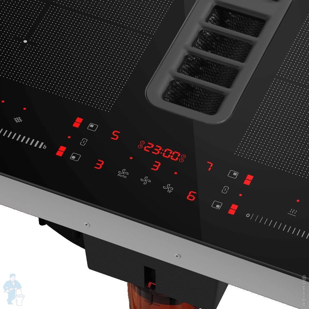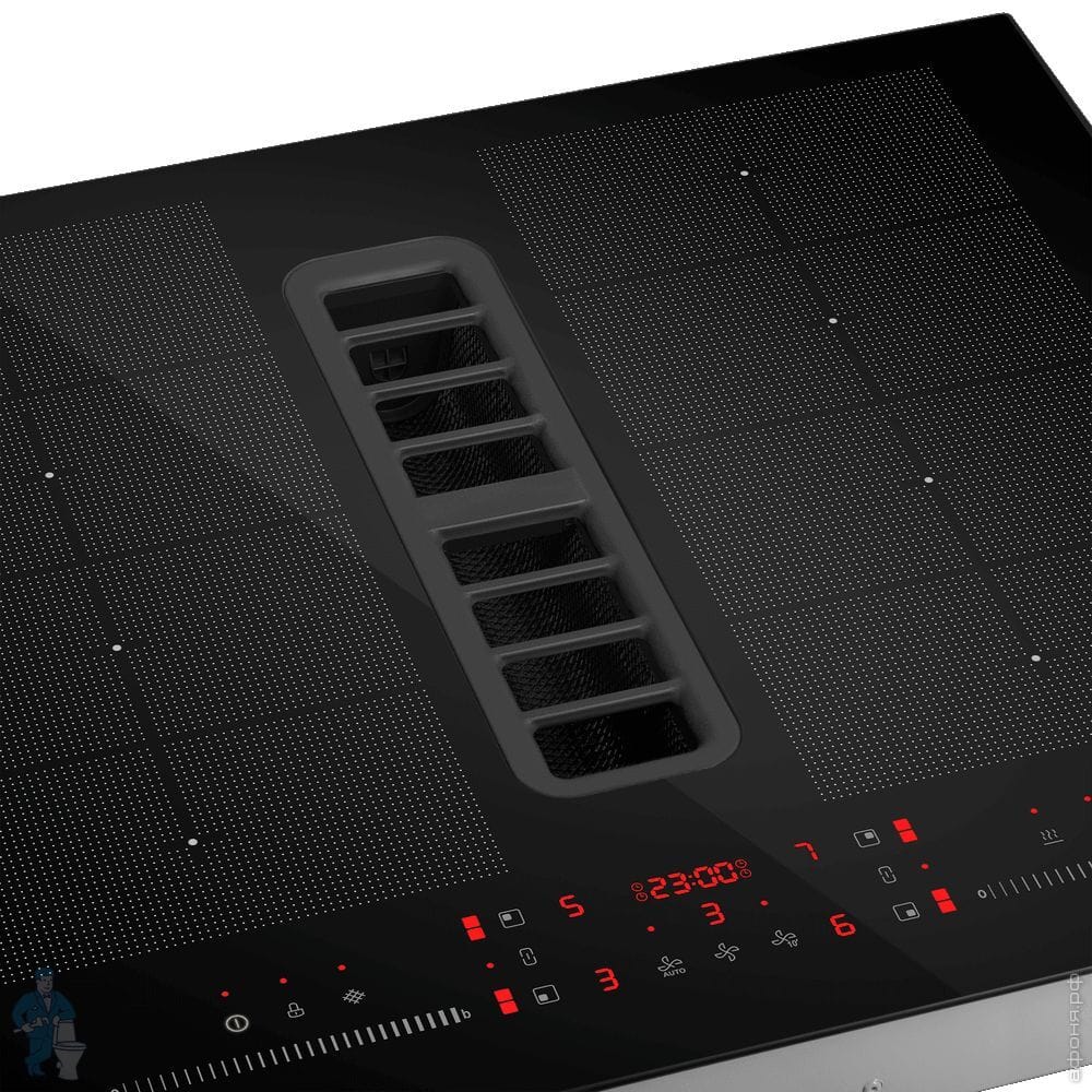-Четыре независимые варочные зоны расположены на черном закаленном стекле. -В центре находится элегантная и прочная решетка, которая скрывает мощную зону вытяжки. .