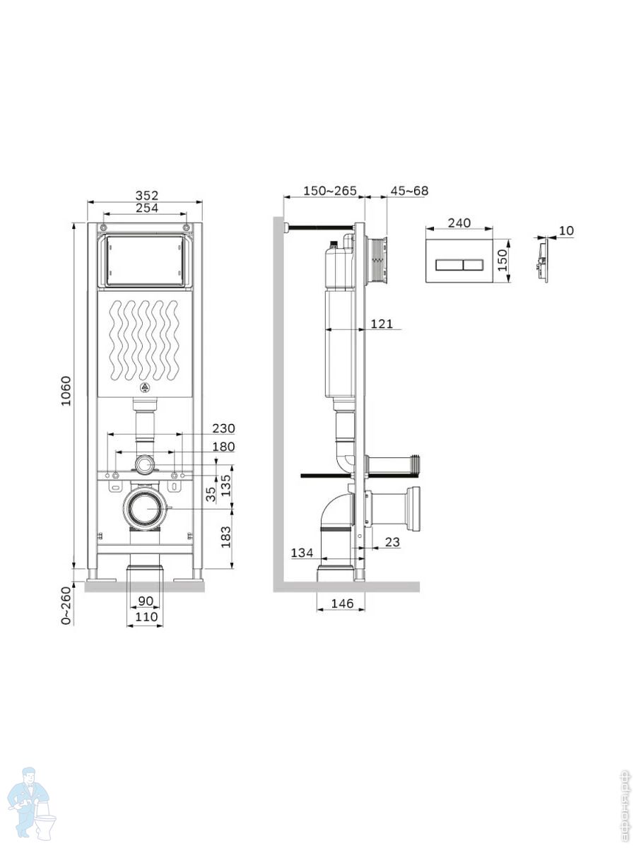 Максимально полный комплект поставки, включающий все необходимые крепления, патрубки и звукоизолирующую прокладку. Экономия пространства благодаря узкой раме - 352 мм шириной. Подходит даже для самых малогабаритных ванных комнат. Заливной клапан с низким уровнем шума - Класс II, согласно европейского стандарта EN 14124. Выдерживает нагрузку до 400 кг. Подходит для унитазов любых размеров. Высокая прочность и износостойкость. Увеличенная толщина профиля, двойные прокладки слива и подачи воды. Подключение воды сзади сверху.