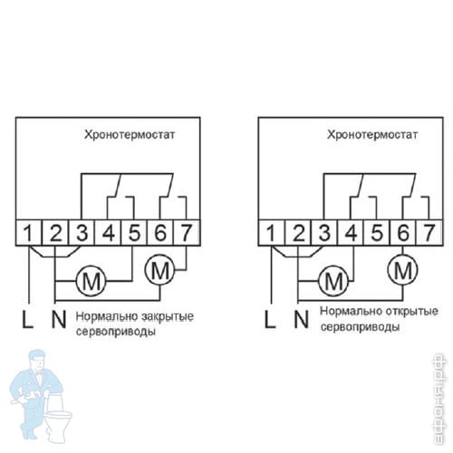 Подключение прибора - трехконтактное. Возможна работа как с нормально закрытыми, так и с нормально открытыми сервоприводами.
