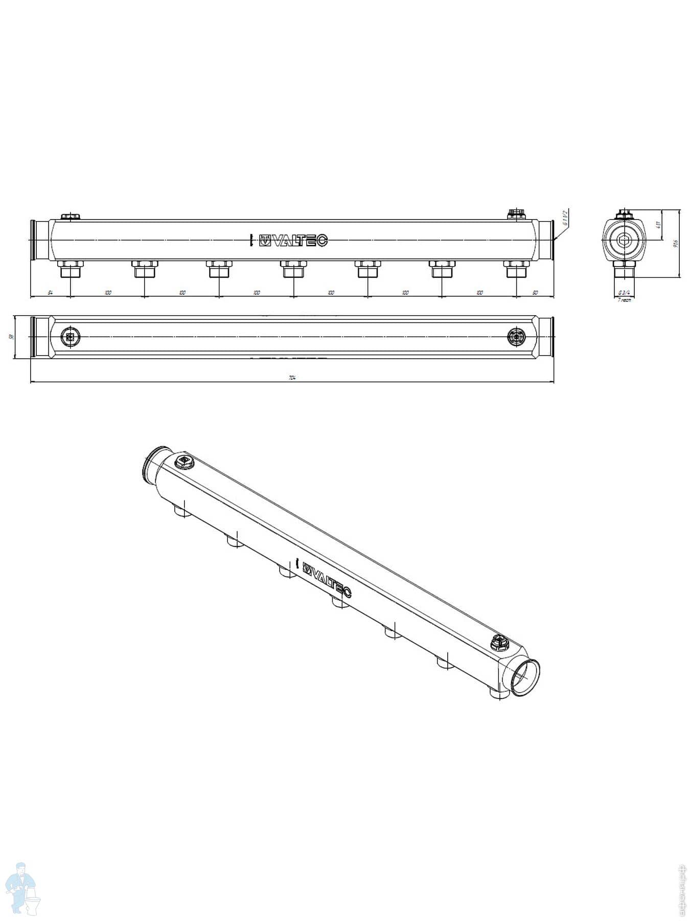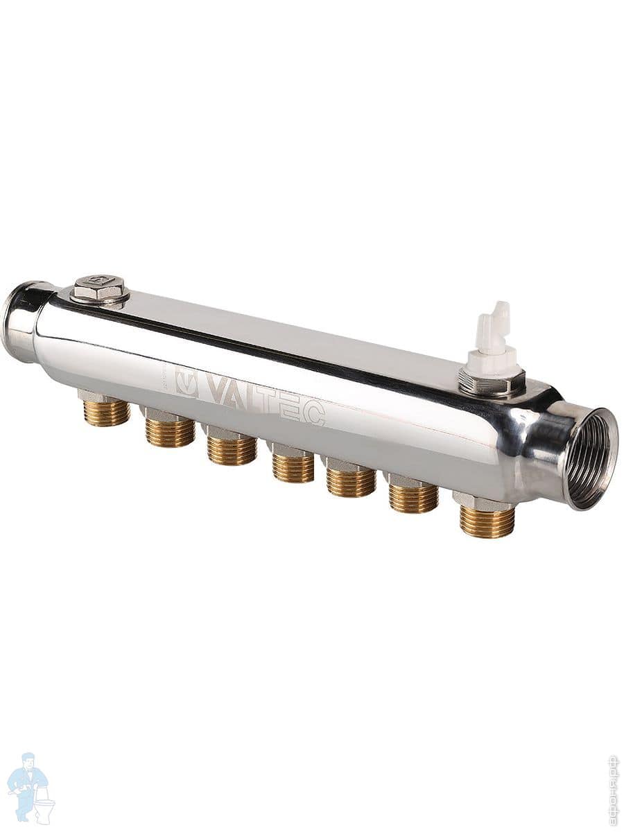 Коллектор VALTEC 1.1/2" на 7 выходов, 3/4"Н с м-о расст вых. 100мм, нерж. сталь, VTc.510.SS.080507