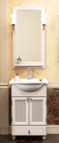 Комплект состоит из зеркала в деревянной раме с двумя изящными светильниками, тумбы с двумя открывающимися дверцами и декоративной решеткой и керамической раковины Дрея (Чехия).