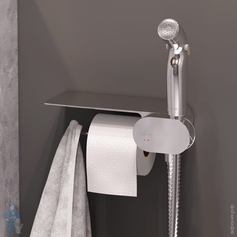 FlashClean - новое поколение безободковых унитазов без использования пластика. Многофункциональный гигиенический набор представляет собой удобную полочку, на которой можно разместить все, что необходимо вам под рукой. На интегрированном держателе можно размещать туалетную бумагу, а на крючке - полотенце. Завершает комплект подвесная cтойка с туалетной щеткой.