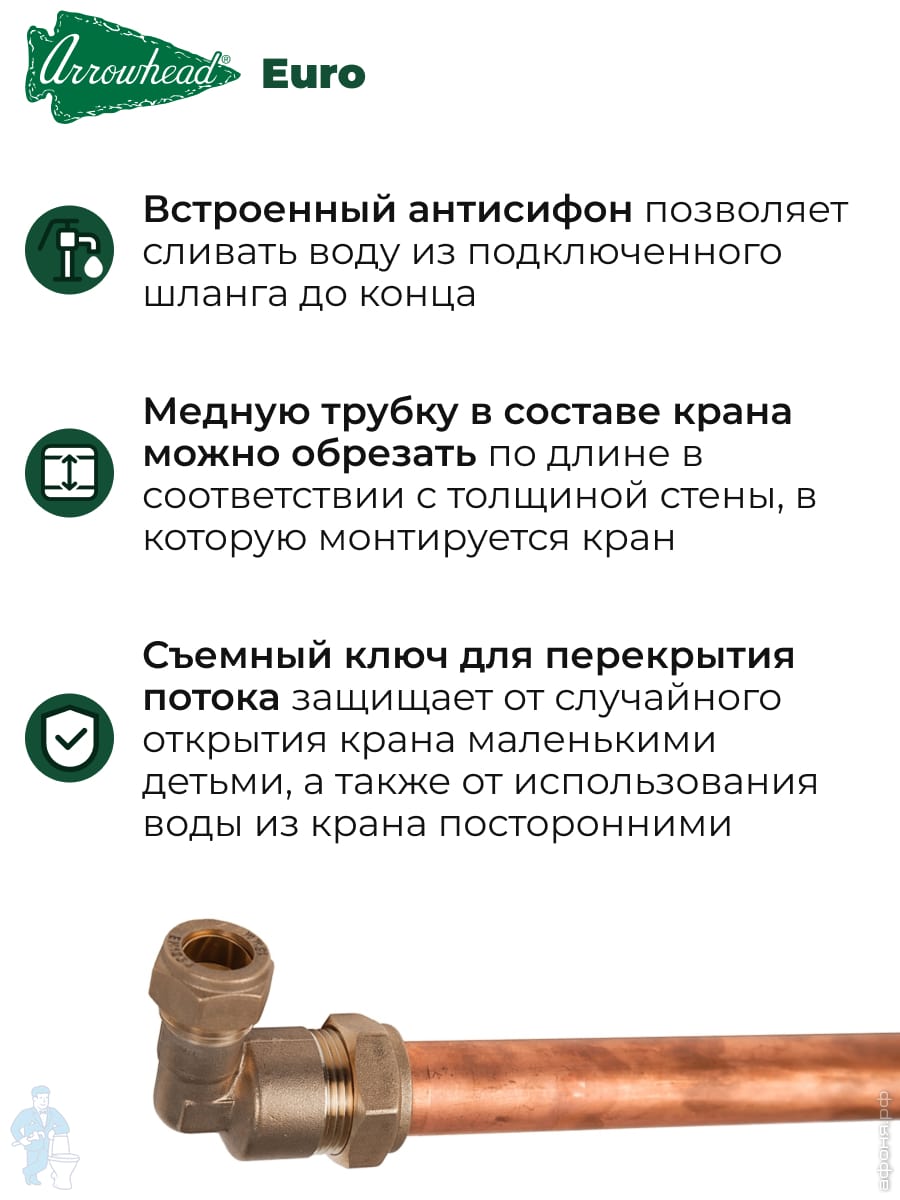 Медную трубку в составе крана можно обрезать по длине в соответствии с толщиной стены, в которую монтируется кран. Съемный ключ для перекрытия потока защищает от случайного открытия крана маленькими детьми, а также от использования воды из крана посторонними