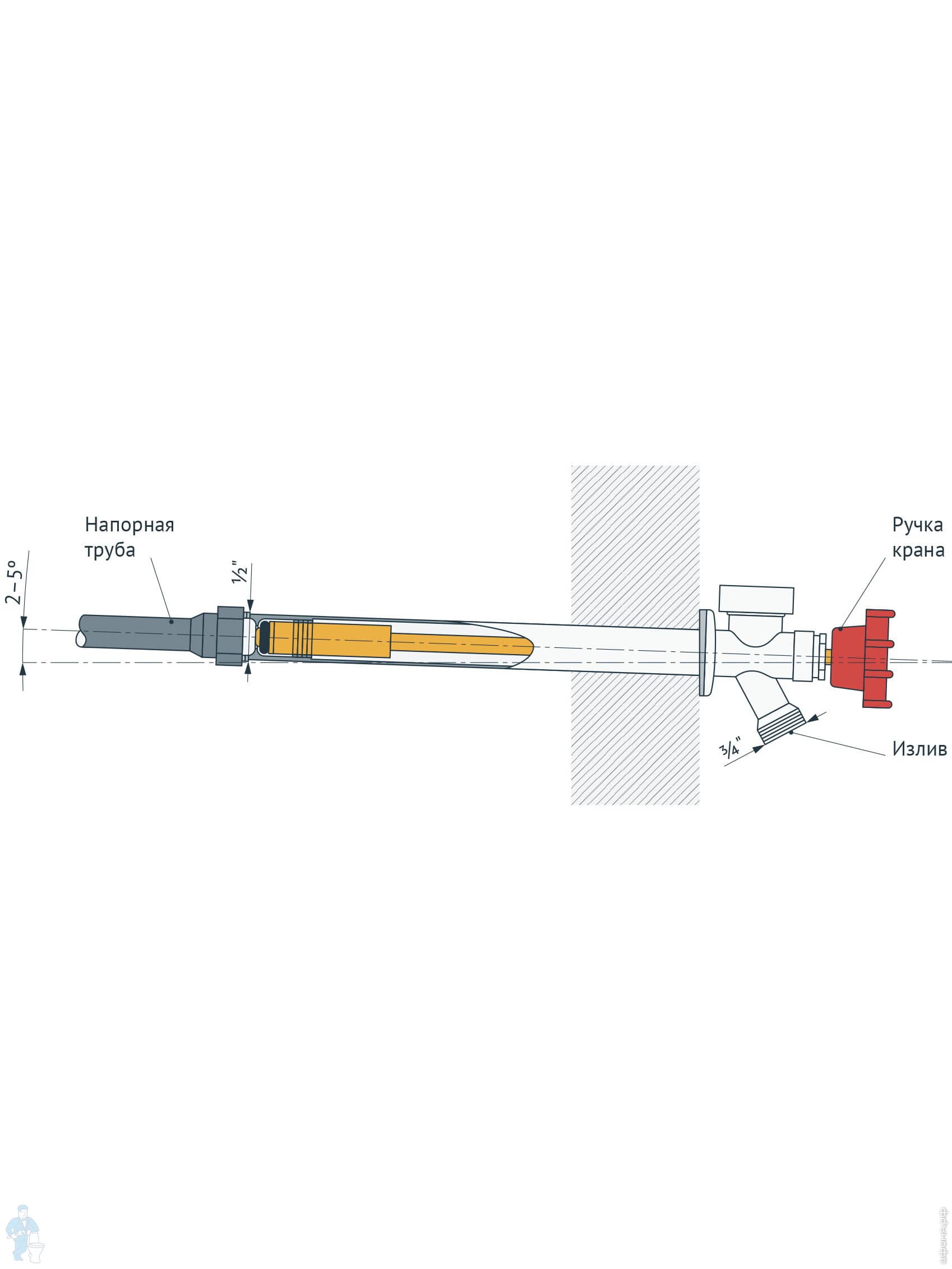 Запорная часть крана находится в пределах отапливаемого помещения, вентиль и излив - на улице, с внешней стороны здания. Остатки воды из наклонного носика вытекают сразу же после прекращения подачи воды под напором, в результате чего исчезает опасность возникновения ледяных пробок, способных препятствовать стоку воды.