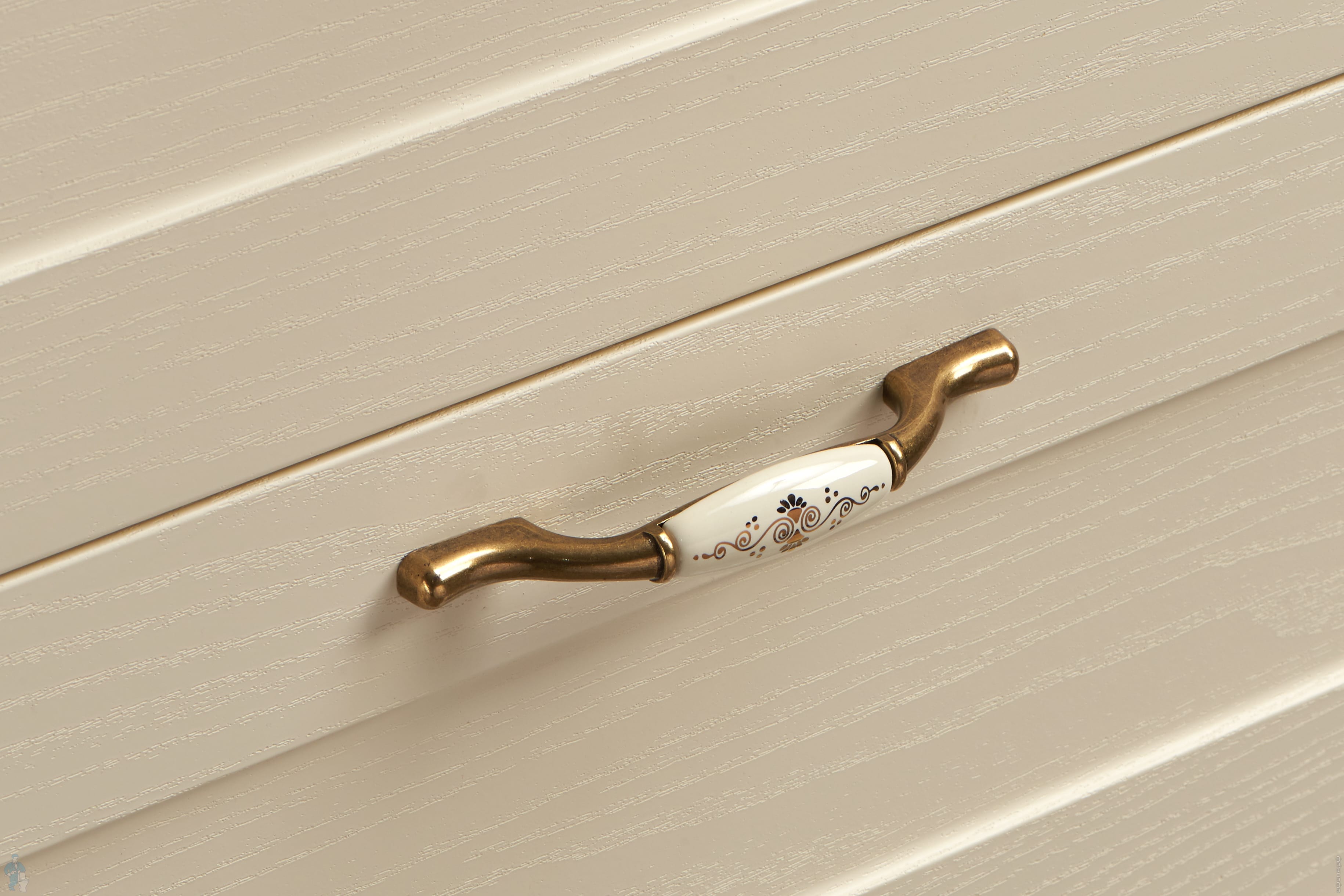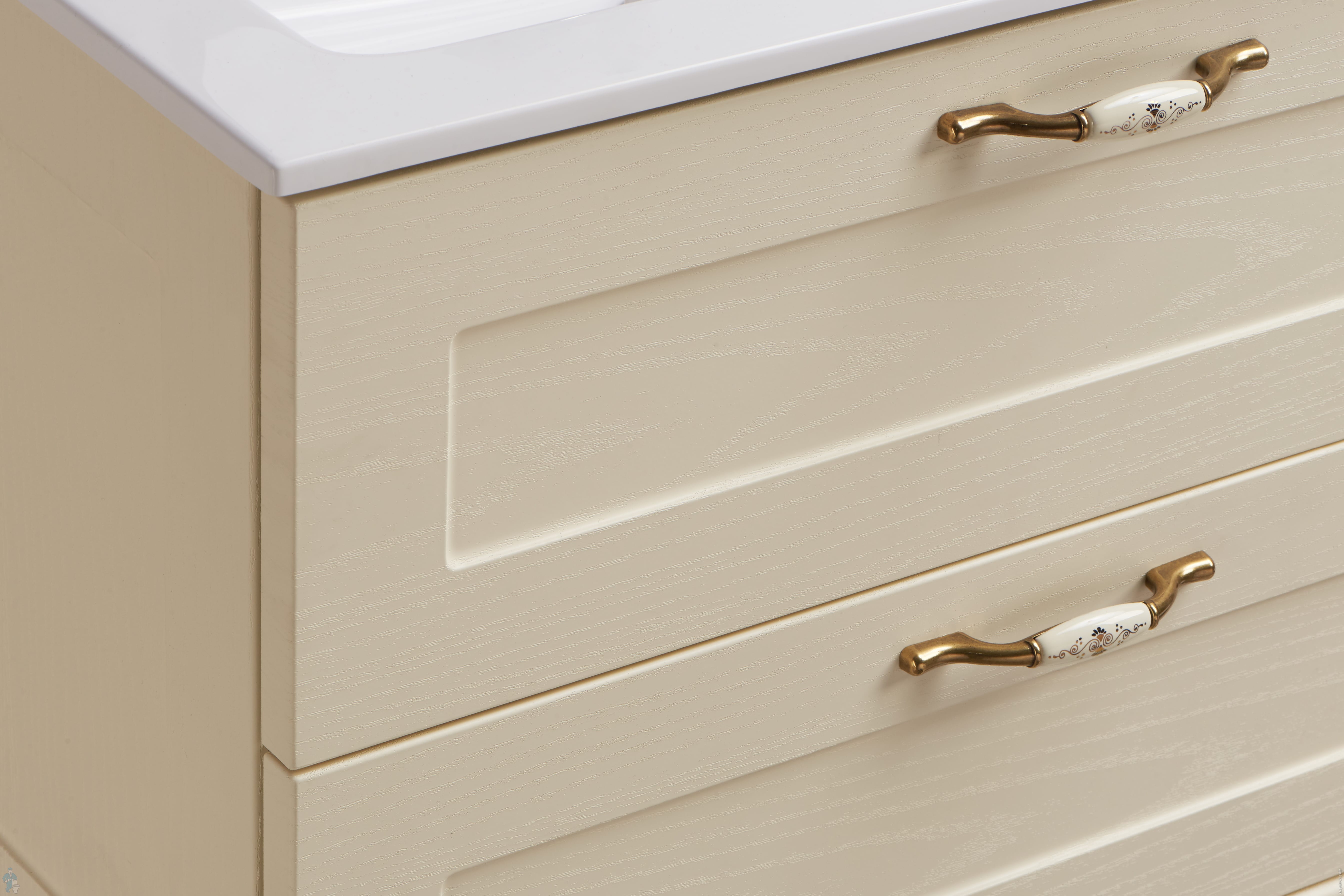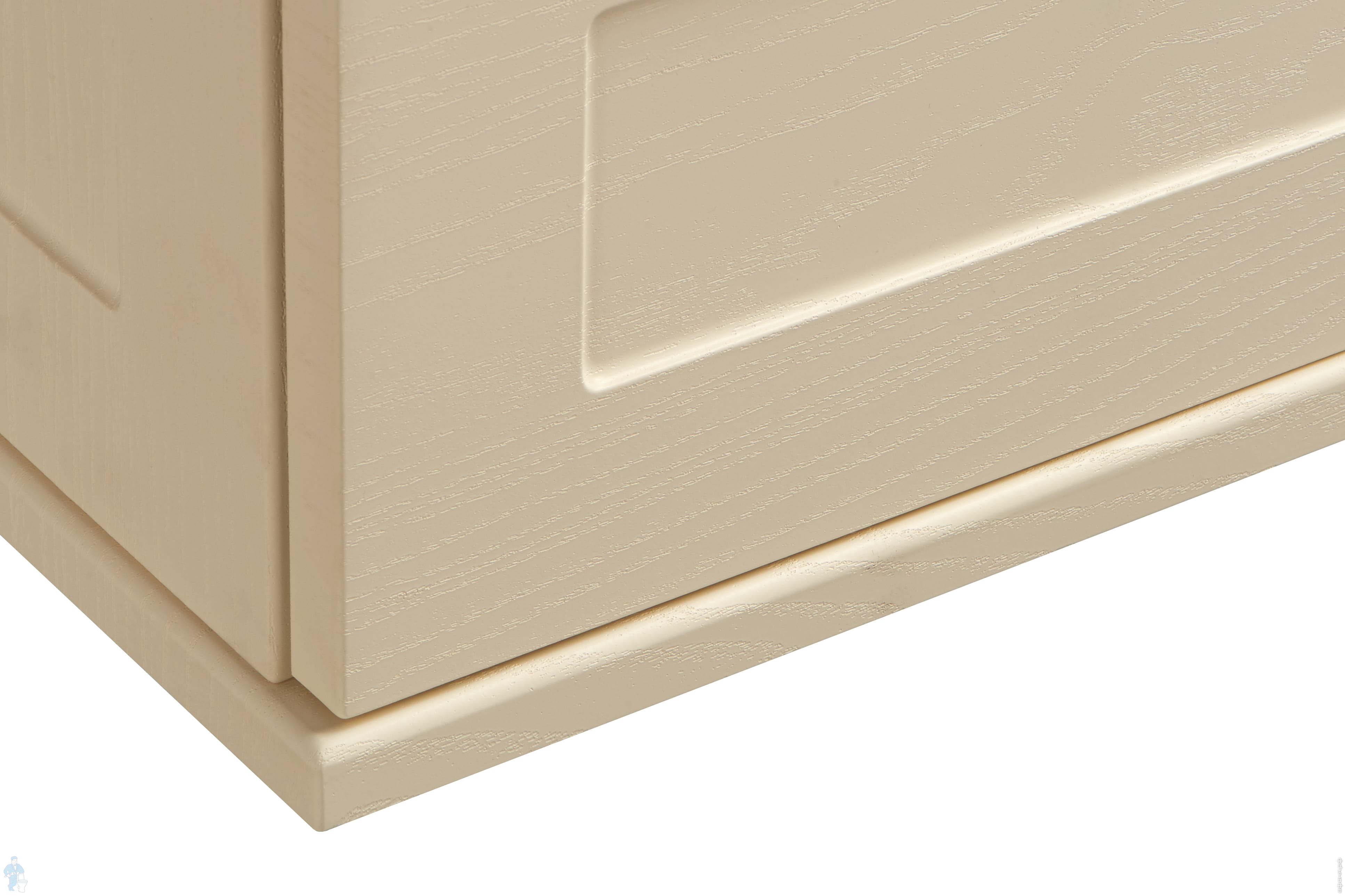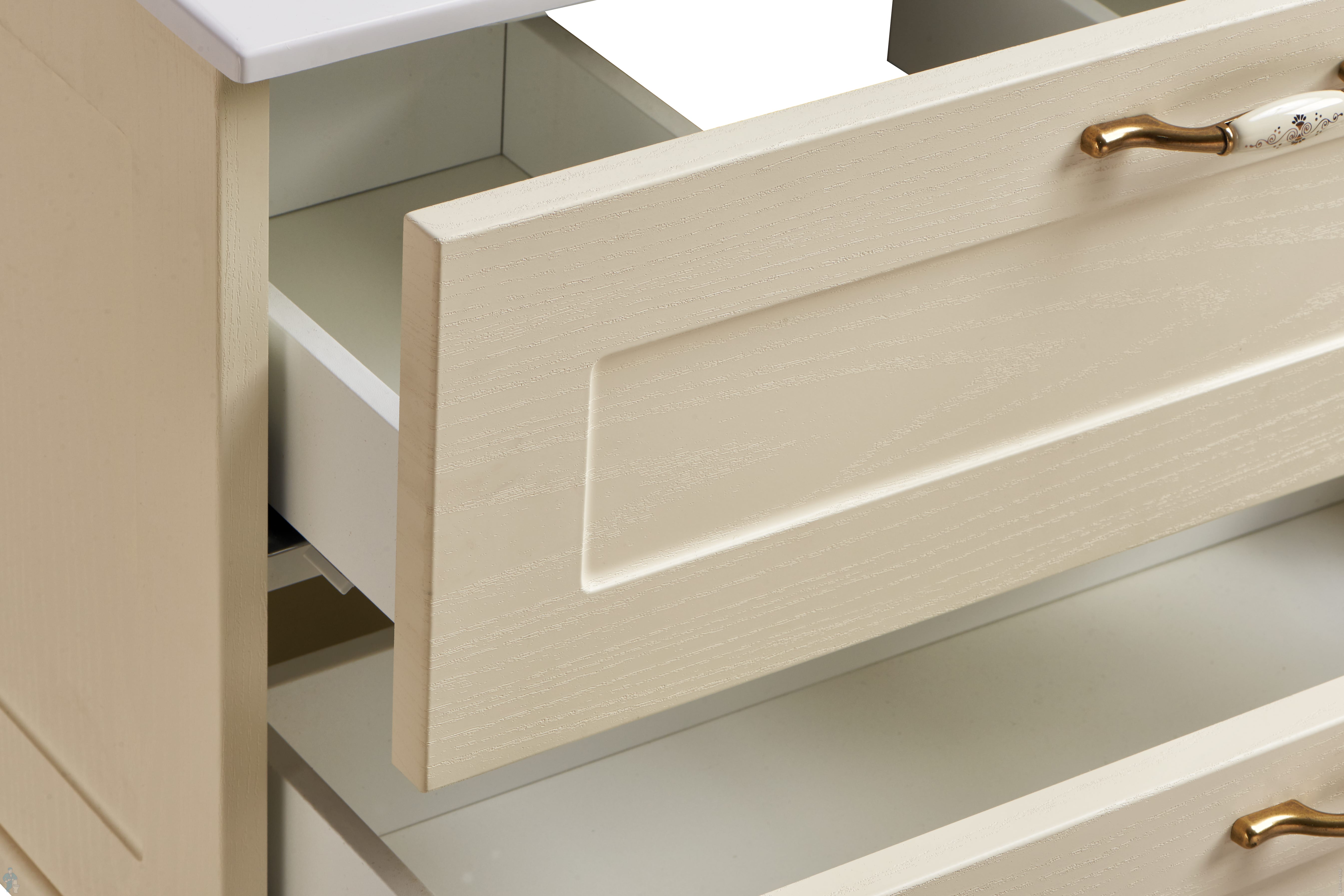 Корпус и фасады выполнены из высококачественной МДФ, покрытой матовой пленкой с фактурой под натуральное дерево. Классическую эстетику модели на ножках подчеркивают изящные ручки от европейского производителя.