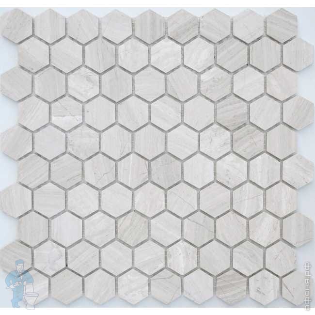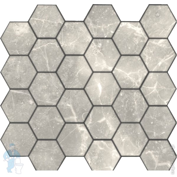 Натуральный серый мрамор в форме шестиугольника (гексагон). Матовая поверхность достигается способом, похожим на формирование морской гальки, благодаря чему поверхность получается без острых зазубрин и приятная на ощупь. При использовании эпоксидной затирки, попробуйте её сначала на малозаметном участке, т.к. под её воздействием без специальных защитных пропиток камень может слегка изменить оттенок.