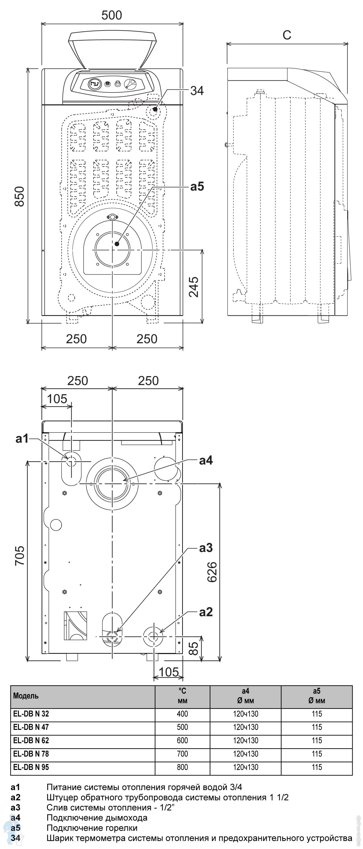 | Масса пустого котла, кг | 127 | 166 | 205 | 244 | 283 |