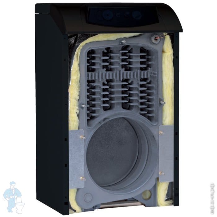 * Высокоэффективный чугунный котел с трехходовым теплообменником с надежной теплоизоляцией слоем минеральной ваты, экранированной алюминиевой фольгой