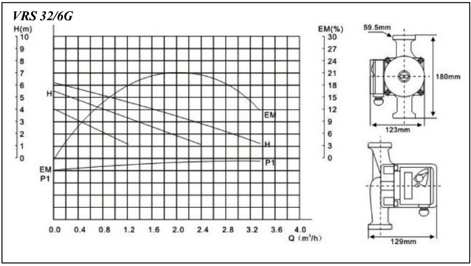 Условный диаметр данной модели - 32 мм, максимальный напор (при нулевой подаче) - 6 м вод. ст., монтажная длина - 180 мм.