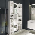 Вместительный многофункциональный шкаф с двумя створками, открывающимися от центра. На задней стенке шкафа расположено зеркало с верхней подсветкой, розетка и выключатель. По бокам расположены открывающиеся от центра секции с полками и крючками для полотенец. Левая секция имеет также держатель для фена. Полки для удобства оборудованы специальными ограничительными бортиками.