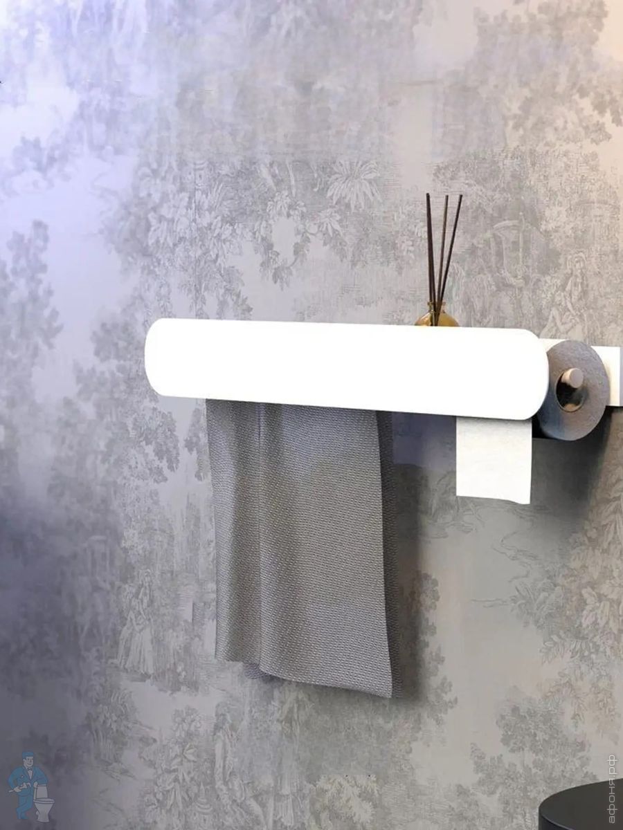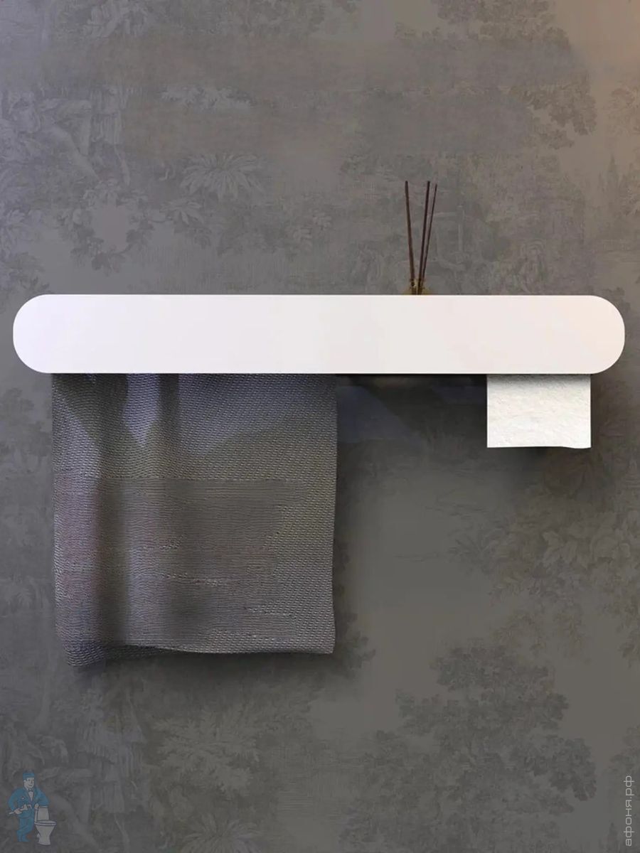 Конструкция состоит из нескольких элементов: отсека для полотенца, полки, держателя для туалетной бумаги. Длина отсека для полотенца 34 см, что позволяет разместить небольшое полотенце для рук или лица.
