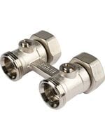 В комплект входят: прямой блок шаровых кранов с накидными гайками G 3/4", 2 соединительных ниппеля G 3/4" x G 1/2".
