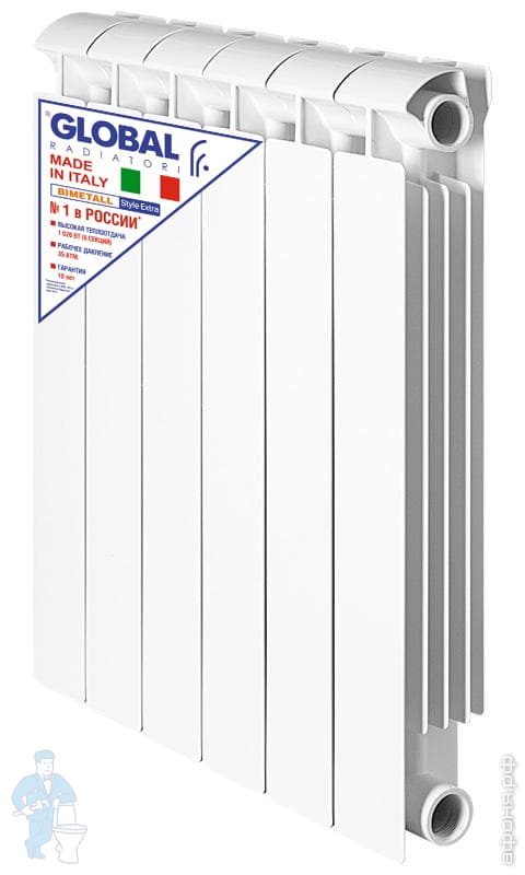 Среди достоинств биметаллических радиаторов необходимо отметить также маленький объем теплоносителя и нейтральность к его химическому составу. Радиаторы Global Style Plus, Style Extra обладают преимуществами по сравнению со своими аналогами других марок: рабочее давление достигает 35 атмосфер, безупречное качество окраски, между секциями проложены высоко надежные паронитовые прокладки для уплотнения стыков.