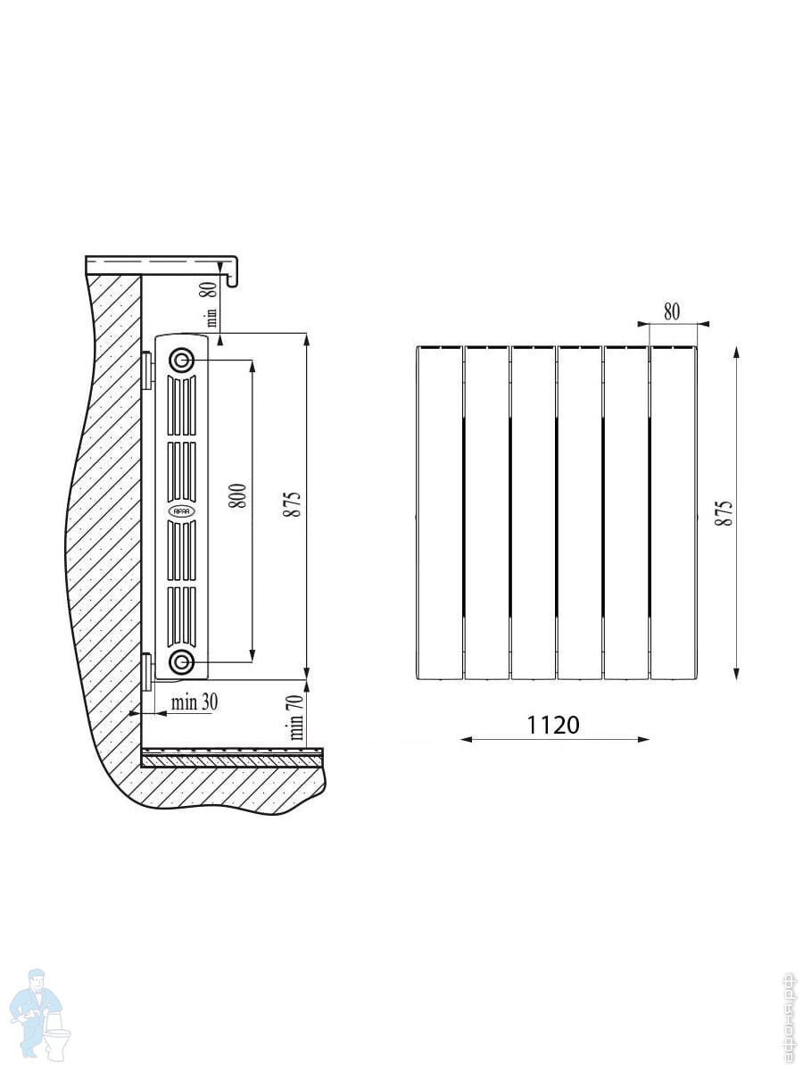 ВАЖНО: Для оптимальной теплоотдачи расстояние между радиатором и полом должно быть 70-120 мм, а между радиатором и подоконником не менее 80 мм. Кронштейны должны обеспечивать расстояние от стены 30-50 мм, а также горизонтальное положение радиатора.