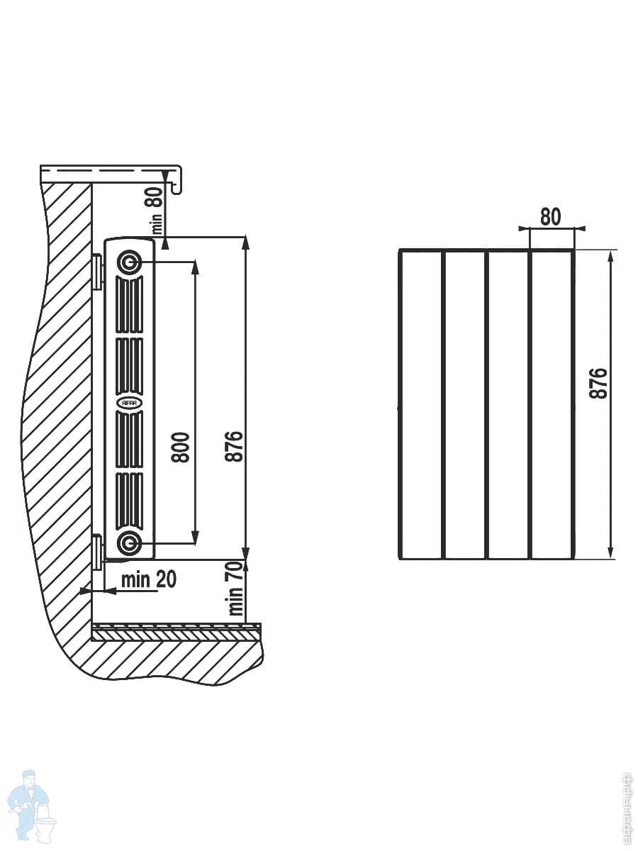ВАЖНО: Для оптимальной теплоотдачи расстояние между радиатором и полом должно быть 70-120 мм, а между радиатором и подоконником не менее 80 мм. Кронштейны должны обеспечивать расстояние от стены 30-50 мм, а также горизонтальное положение радиатора.