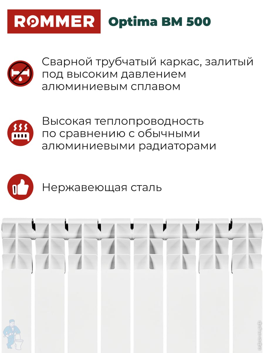 Радиатор биметаллический ROMMER Optima BM 500 8 секций, RBM-0210-050008