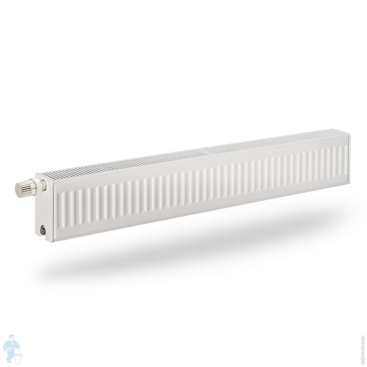 Панельные радиаторы с конвекционными элементами и вмонтированным вкладышем термостатического крана, боковые поверхности закрыты защитными элементами, верхняя поверхность закрыта планкой типа «гриль». Вмонтированный подсоединительный комплект позволяет подключить радиатор как с низу, так и с боку. Два нижних подсоединительных отверстия для подключения на уровне пола, а также четыре боковых подсоединительных отверстия в каждом углу радиатора. Все отверстия имеют внутреннюю резьбу G1/2.
