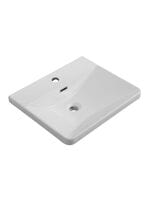 Раковина выполнена из керамики, имеет прямоугольную форму и белый глянцевый цвет. На раковине имеется отверстие под смеситель.