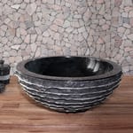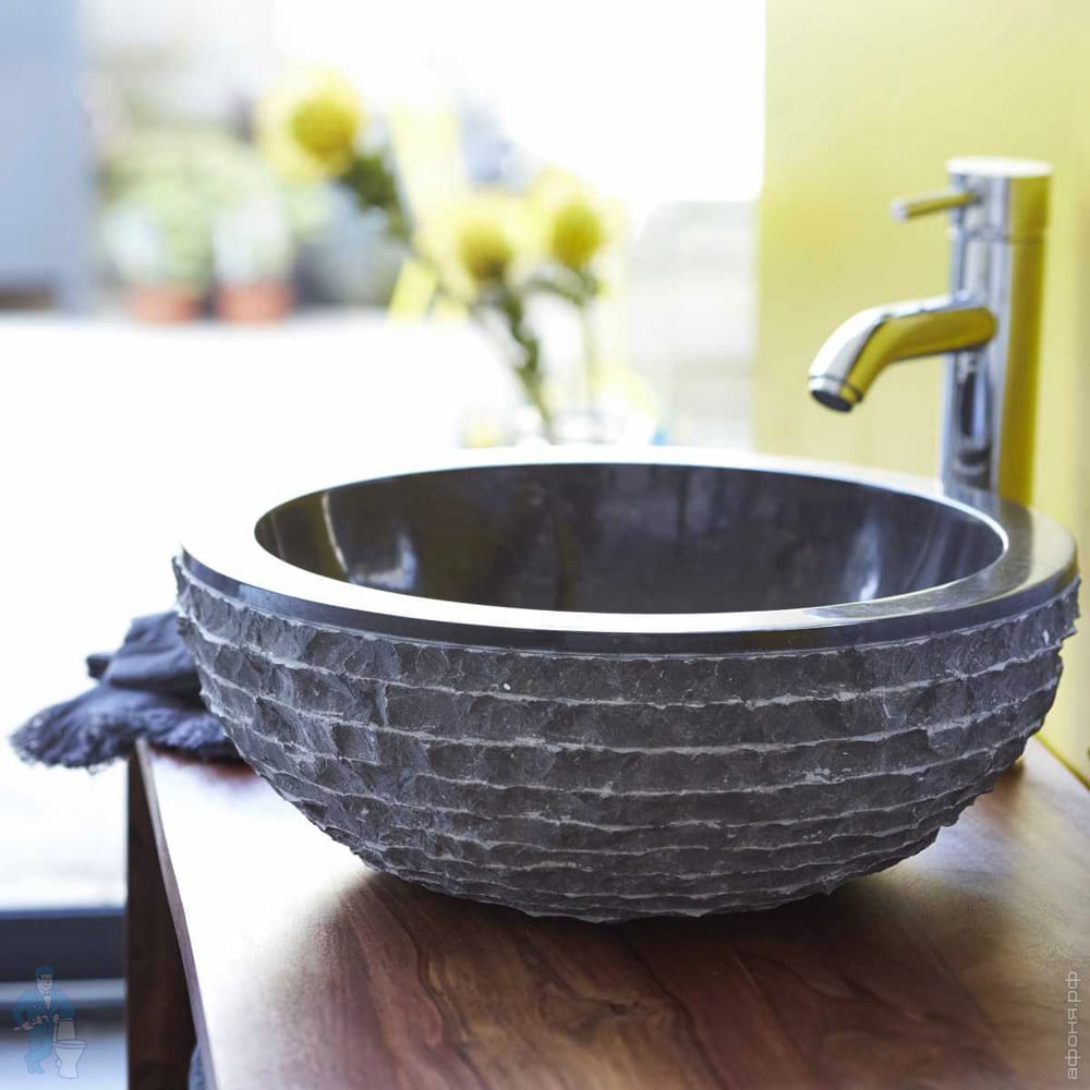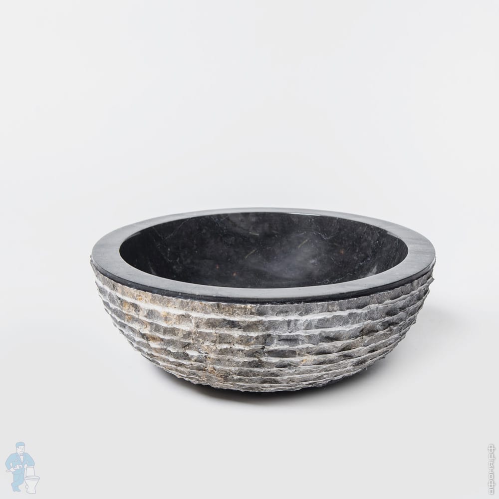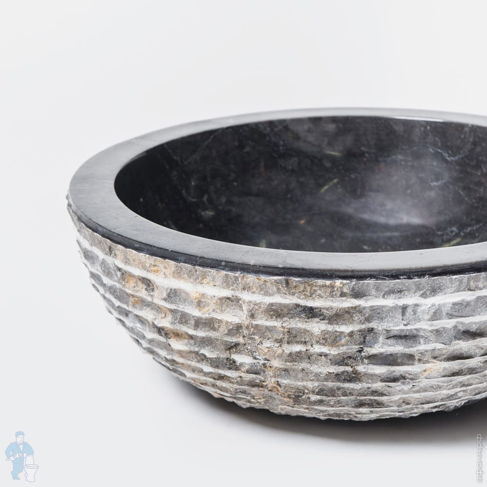 Черная раковина округлой формы вырезана из натурального мрамора. Внешняя часть имеет оригинальную фактуру. Цветовой оттенок может отличаться от модели, представленной на фотографии, по причине индивидуальности природного материала.