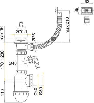 Сифон для мойки Alcaplast A444P с нерж. решёткой D70, гофропереливом и отводом д/стир.машины D-50/40