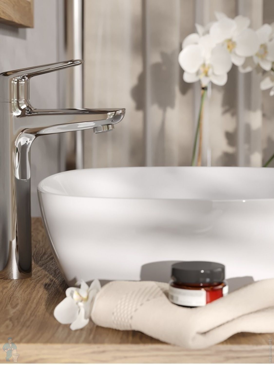 Позволит создать привлекательный интерьер ванной комнаты в актуальном стиле: смеситель может монтироваться как на умывальник (или умывальник-чашу), так и на мебельную тумбу, на которой расположен настольный умывальник.