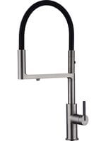 Гибкий силиконовый излив оснащен функцией деликатного душа и магнитным механизмом фиксации в задней части латунного корпуса. Он позволяет ополоснуть посуду или мойку в любой ее части или наполнить емкости даже на столе рядом с мойкой.