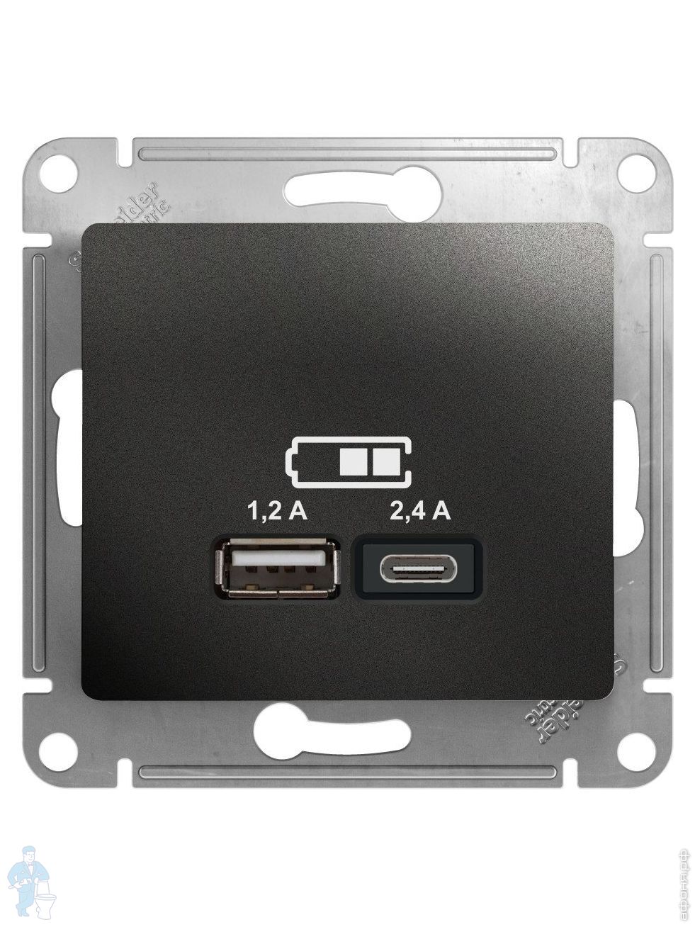 - Розетка Systeme Electric (ранее Schneider Electric) серии Glossa (цвет антрацит) двойная USB с разъемами типа A+C.